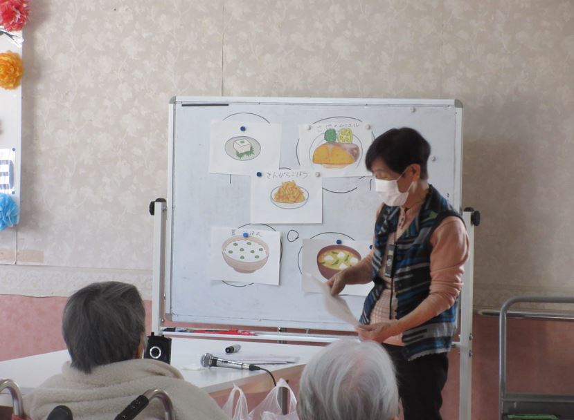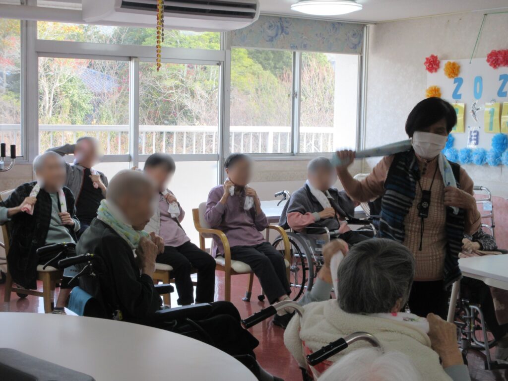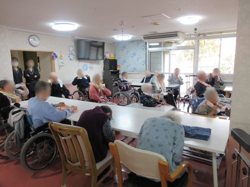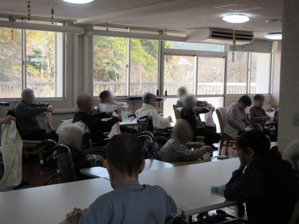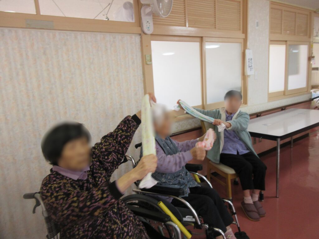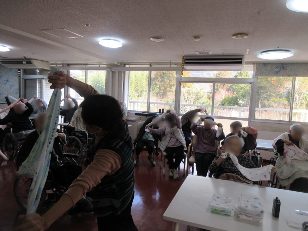 歌に合わせてタオルの両端を掴んで上に持ち上げたり、タオルを縦に持ってクルクル巻いたり、色々な種類の腕や指の体操ができました。周りの人とタオルを巻くスピードを競っている方もいて、楽しく運動されていました。