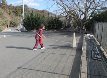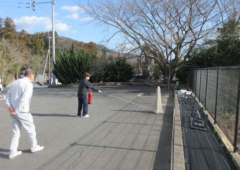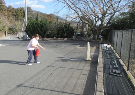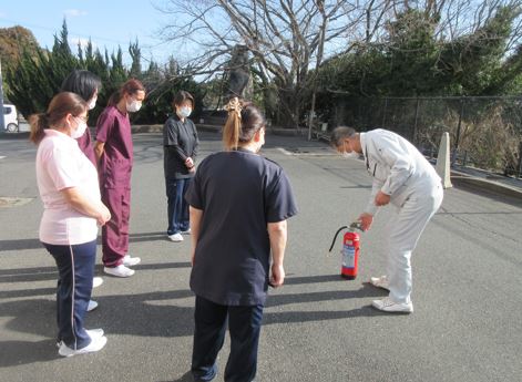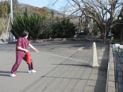 新入職員は実践で消火器の扱い方を経験してもらいます。