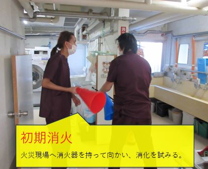 洗濯場での火災を想定した訓練。